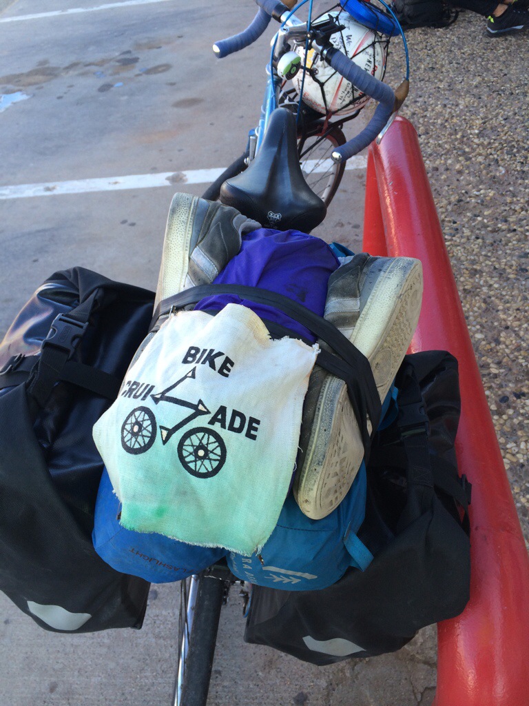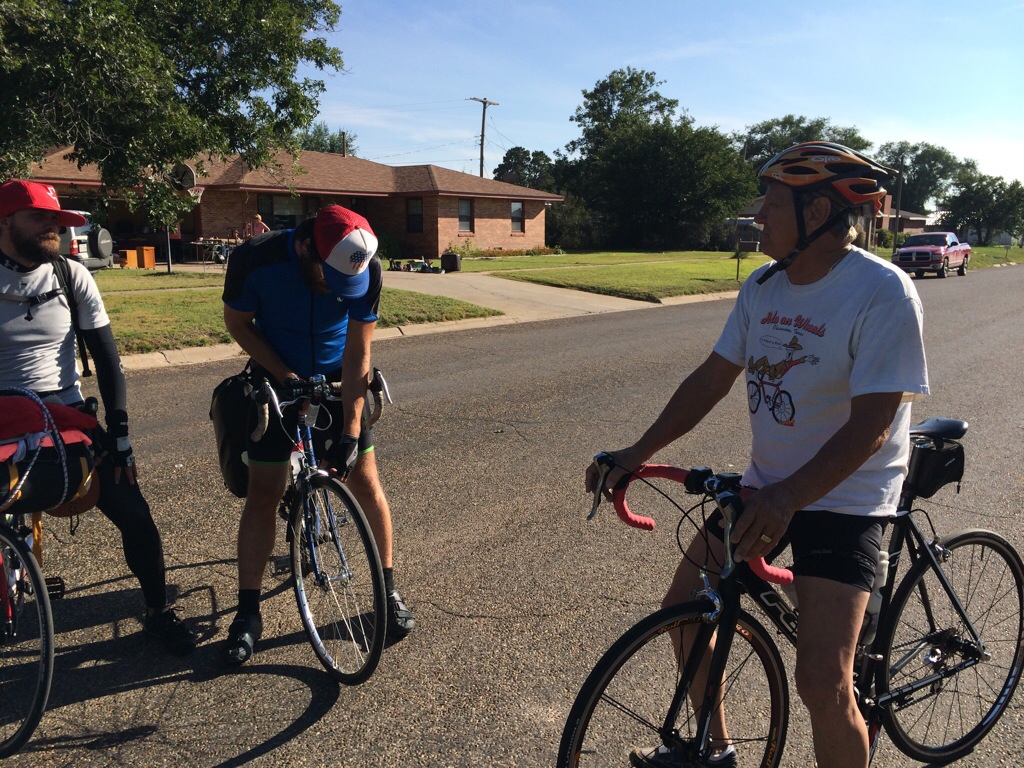 We stopped one more time in Muleshoe at the dollar store to stock up on gloves, tights and a beanie because it’s about to start getting really cold. There was a sign for a garage sale up the road so we stopped by and chatted with the nice family there. The owner of the house said she lived in a tent for three years just traveling around the country. They were very nice and even gave me a purple bandana and belt with a gold buckle. I’m pretty sure it’s women’s clothing but I’ll take what I can get. As we left their garage a man on a fancy Felt bike rode past and we yelled at him to join us to San Francisco.