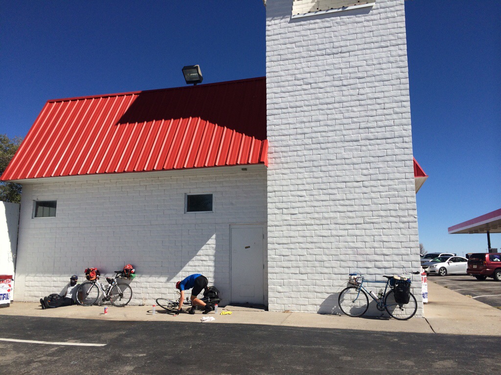 We did well by riding 40 miles without a break before seeing the infamous Dairy Queen off I 40. There must have been 30 billboards advertising how much fun we would have and how much food we would have at the Diary Queen/C Ranch combo in Encino,NM. After doing serious work on some food we had to do some work on a flat tire Dave got on the way out of the parking lot. This put us about an hour behind schedule and may have cost us the chance of reaching our goal of ABQ.