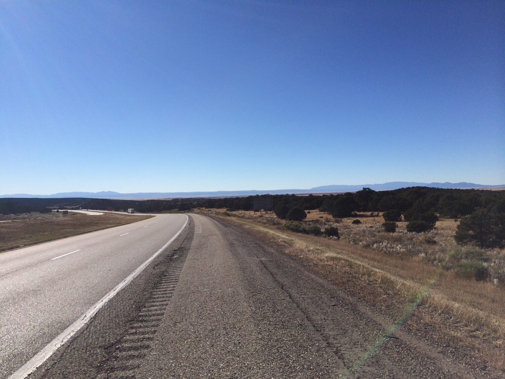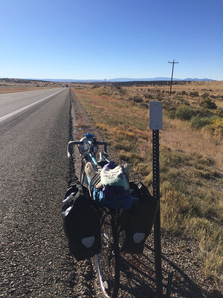 We started the day dressed like ninjas in our black tights and whatever long-sleeved warm clothing we had. The 8 am air was nice and cold but once we started climbing hills out of Santa Rosa we shed our layers and started to sweat. It was either going to be a 90 mile day to Edgewood or 116 mile day to Albuquerque.