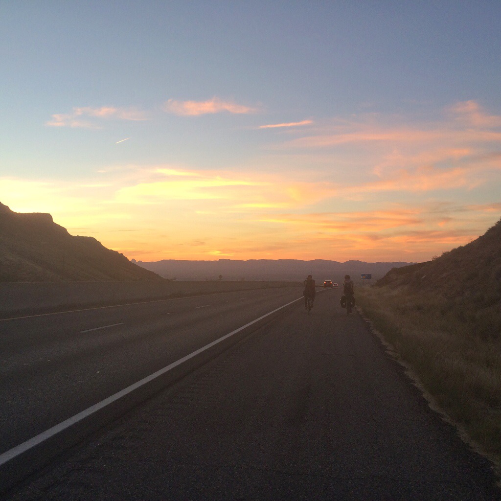 We are about to head into the Mojave National Forest today so had this happened anywhere else we would have been without a bike shop for hundreds of miles. Specialized bicycles make special sized spokes which the bike shop didn’t have. By the time they found a wheel that would work for him we only had 2 hours of daylight left to finish 38 miles. We could have either stayed in Kingman or push for the 108 mile day to Nevada. So we went for it!