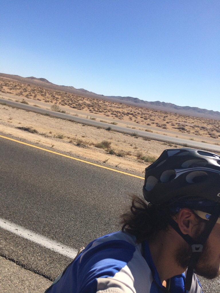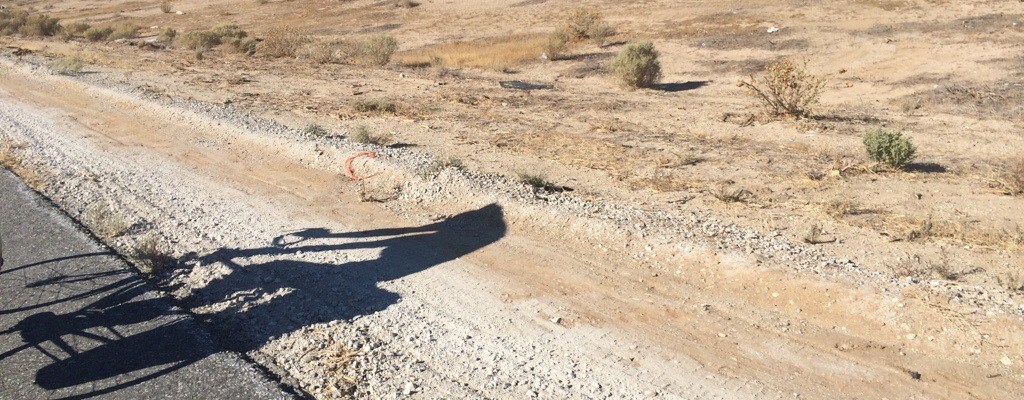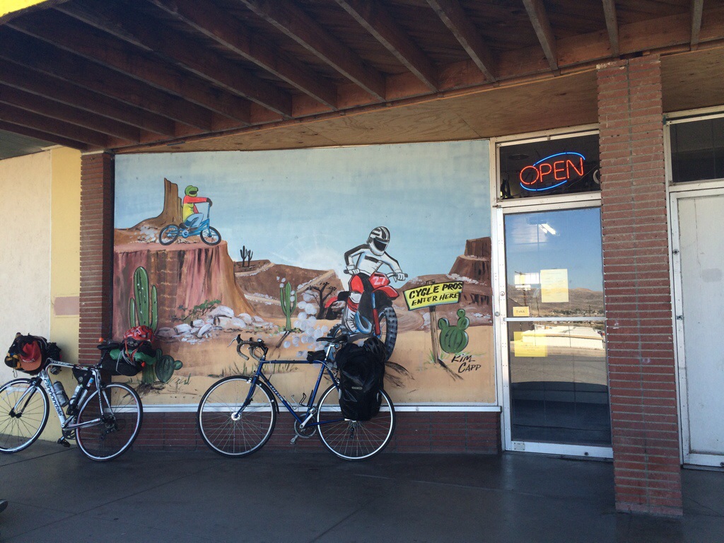 The next 30 miles was difficult as we rode though the desert on a new road, Highway 58. It was a smaller shoulder with a lot of obstacles to dodge. Blown out 18 wheeler tires are the worst and most common. You can ride over them. It may feel fine at first because it’s rubber on rubber but they actually have little wires inside them that are frayed and will poke holes in your tube. I swerved to miss one while riding too close to Dave. My front wheel caught his back right bag sending me to the pavement. I broke my fall with my wrists but there was no major damage done to me or the bike. It was a nice reminder how quickly the road can end your trip if you aren’t focused.